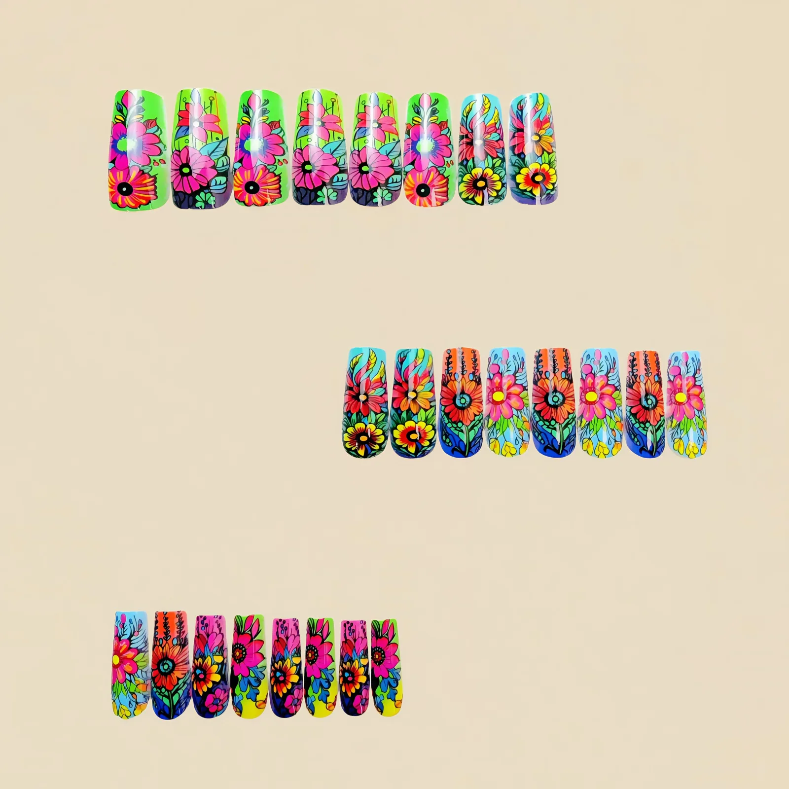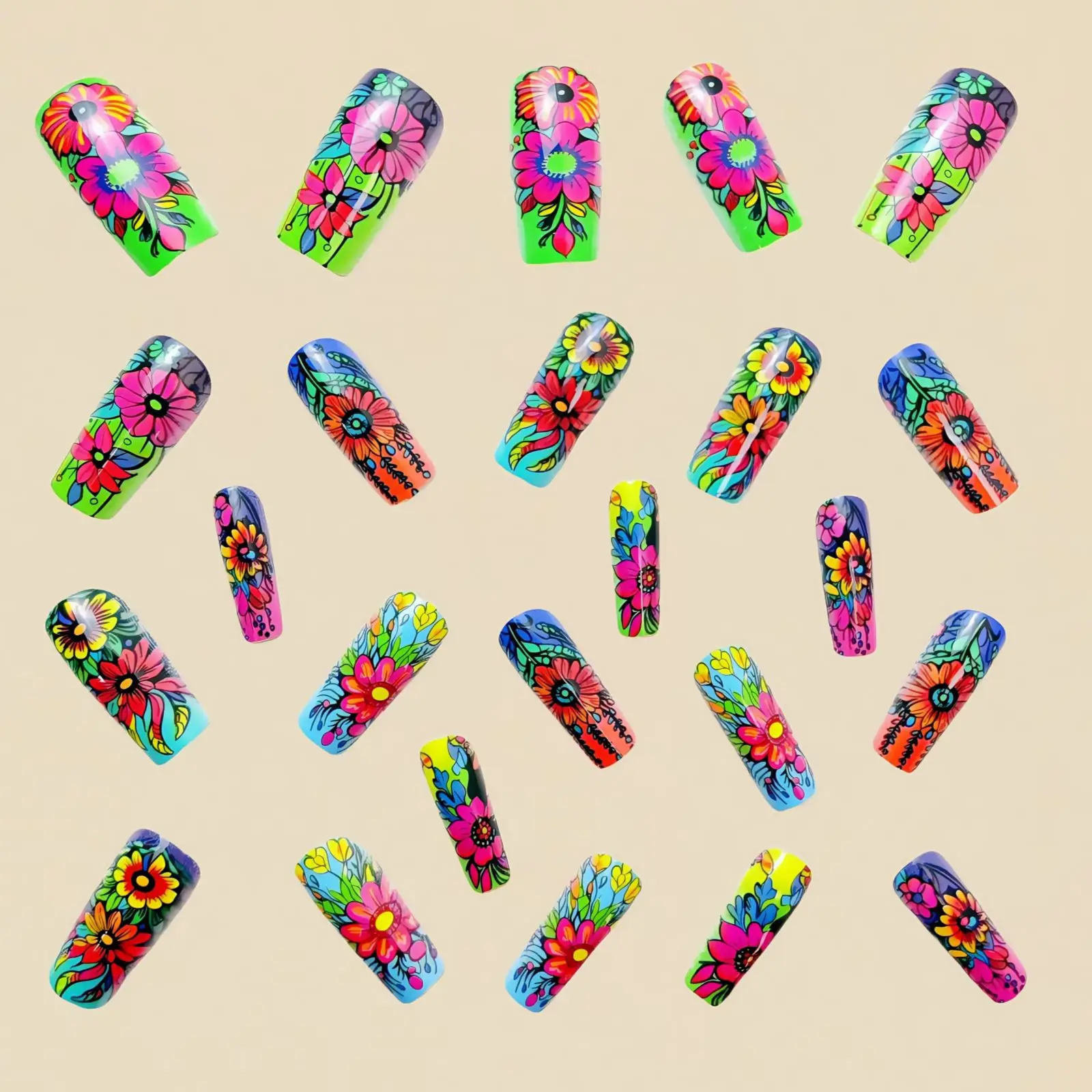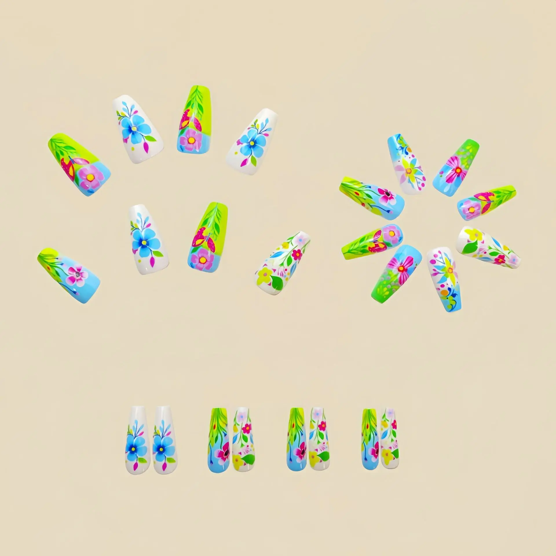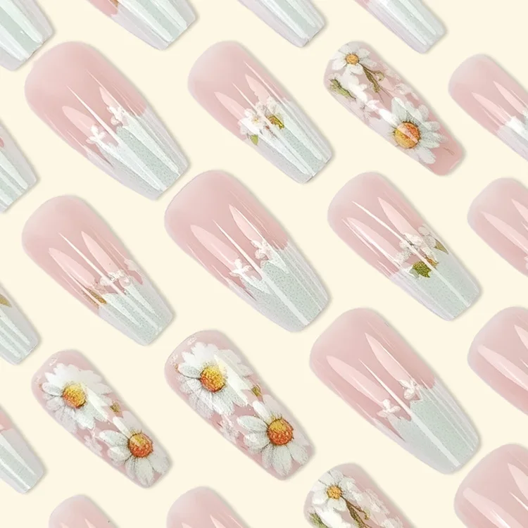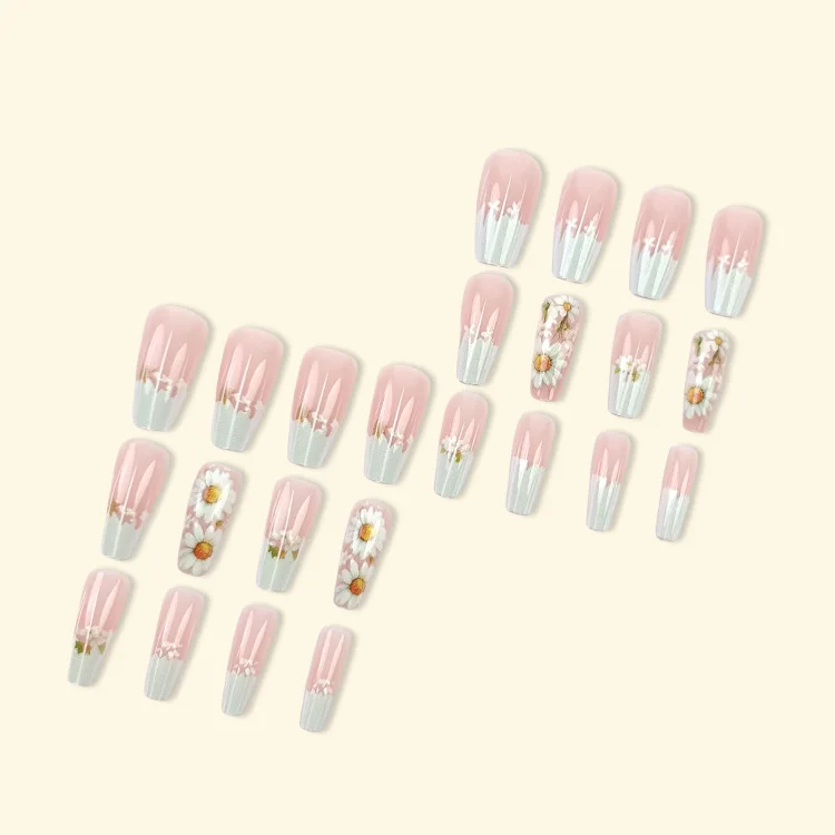 24pcs/set Short Medium fake nails for Spring summer season beautiful colourful flowers faux ongles tips press on false nail art