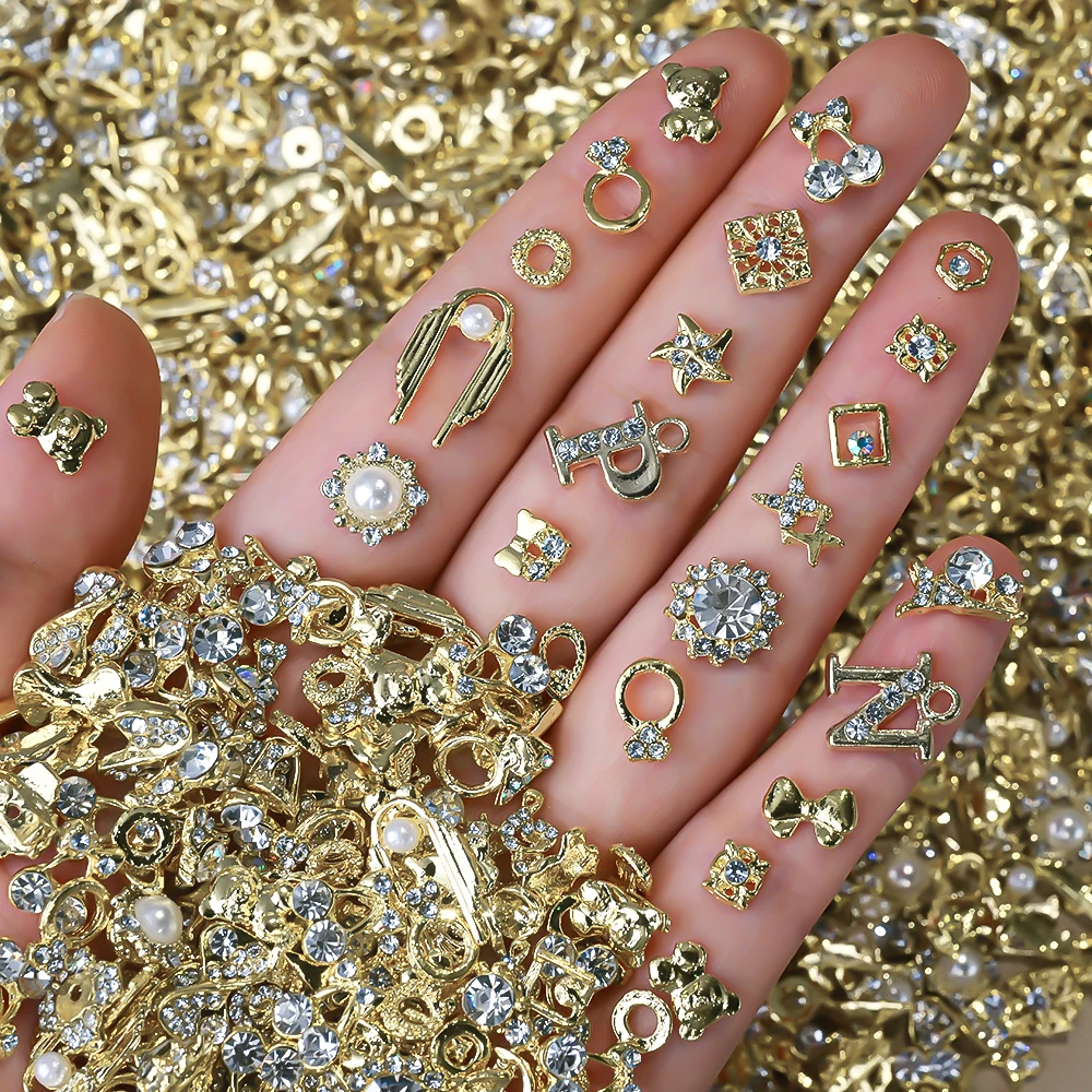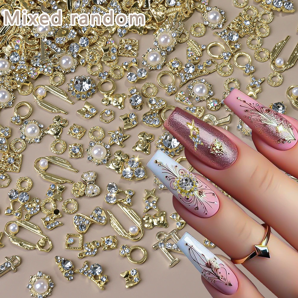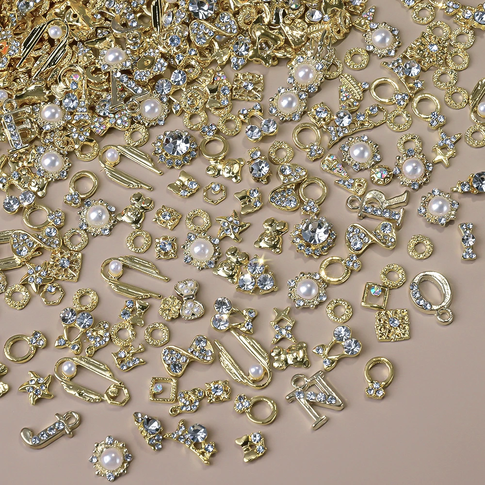 50Pcs 3D Mixed Random Luxury Nail Charms Metal Gold/Silver Butterfly/Bowknot Nail Art Decoration With Crystal Manicure Jewelry