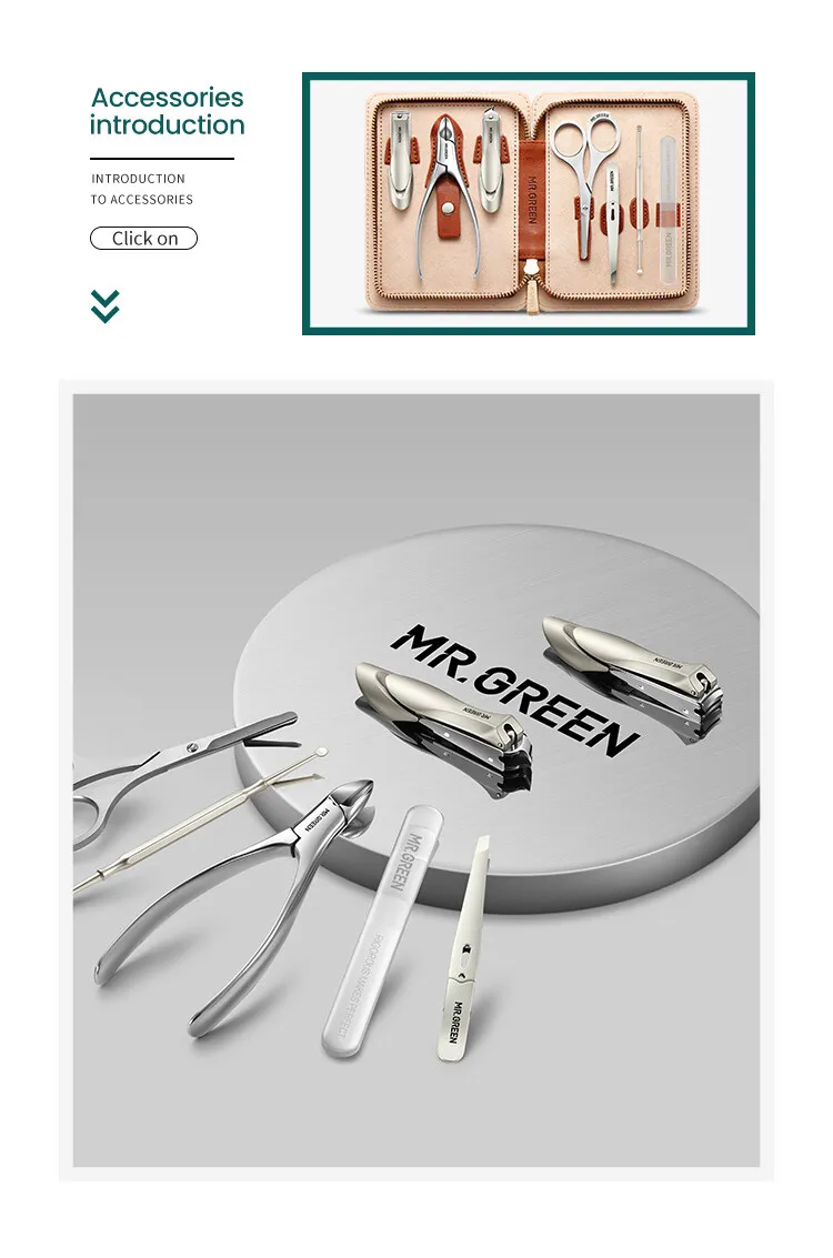 1. This is a high-grade personal care package that can meet the needs of daily use, including many high-quality personal care accessories:Nail Clipper, Oblique Clipper, Olecranon toenail clipper, Facial Hair Scissors,Nail File, Eyebrow Tweezer, Ear Pick.